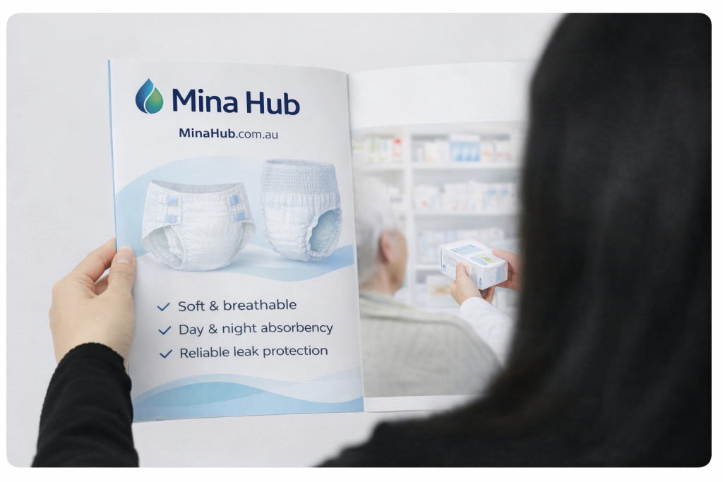 Mina Hub supplies pharmacies and NDIS participants with high-comfort disposable products, clear absorption levels and sizes, and simple re-order options so families can manage continence with dignity at home.